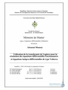 Utilisation de la transformée de Laplace pour la résolution des équations différentielles fractionnaires et équations intégro-différentielles de type Volterra |