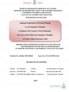 Adopting Negotiation of Decision-Making As a Participatory Dialogue to Enhance The Learner’s Oral Production. The Case of The Third Year Students of English At Ferhat Abbas University- Sétif |