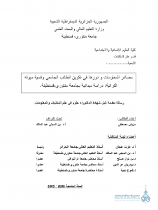 المذكرة بعنوان “مصادر المعلومات ودورها في تكوين الطالب الجامعي وتنمية ميوله القرائية – دراسة ميدانية بجامعة منتوري قسنطينة “