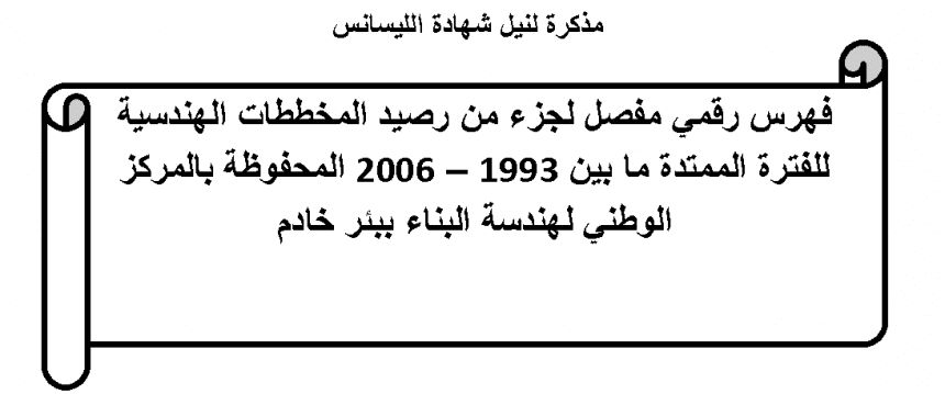 المذكرة بعنوان “فهرس رقمي مفصل لجزء من رصيد المخططات الهندسية للفترة الممتدة ما بين 1993-2006 المحفوظة بالمركز الوطني لهندسة البناء ببئر خادم “