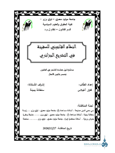 مقدمة الفصل الأول : ماهية السفينة المبحث الأول: مفهوم السفينة المطلب الأول: تعريف السفينة الفرع الأول: تعريف السفينة عند الفقه الفرع الثاني: تعريف السفينة في القضاء الفرع الثالث: التعريف القانوني للسفينة أولا: تعريف السفينة على مستوي القانون الدولي الإتفاقي – الاتفاقيات العامة المتعلقة بالبحار – الاتفاقيات ذات الصلة بالسفينة ثانيا: تعريف السفينة في الممارسة الوطنية للدول – تعريف السفينة في التشريعات المقارنة – تعريف السفينة في القانون الجزائري المطلب الثاني: الطبيعة القانونية للسفينة الفرع الأول: الجدل الفقهي حول مسألة الطبيعة القانونية للسفينة أولا: السفينة مال منقول meuble ثانيا: السفينة من الأموال العقارية Immeuble ثالثا: السفينة شخص قانوني رابعا: السفينة ذو طبيعة خاصة الفرع الثاني: الطبيعة القانونية للسفينة في التشريعات الوطنية أولا: قانون البحري المصري ثانيا: القانون البحري الليبي ثالثا: القانون التجاري البلجيكي الفرع الثالث: موقف المشرع الجزائري حول الطبيعة القانونية للسفينة المبحث الثاني: الأشخاص القانوني في السفينة المطلب الأول: الأشخاص البحريون للسفينة الفرع الأول: المجهز أولا: تعريف المجهز ثانيا: التزامات المجهز ثالثا: صلاحيات المجهز رابعا: مسؤولية المجهز الفرع الثاني: الربان أولا: تعريفه ثانيا: إختصاصات الربان ثالثا: مسؤولية الربان الفرع الثالث: البحارة أولا: تعريف البحارة ثانيا: تقسيم البحارة ثالثا: علاقة البحارة بالمجهز رابعا: إلتزامات رجال البحر وحقوقهم خامسا: مسؤولية رجال البحر الفرع الرابع: المرشد أولا: تعريفه ثانيا: إلتزامات المرشد ثالثا: مسؤولية المرشد المطلب الثاني: الأشخاص البريون للسفينة الفرع الأول: وكيل السفينة أولا: تعريفه ثانيا: المركز القانوني لوكيل السفينة ثالثا: إلتزامات وكيل السفينة رابعا: مسؤولية وكيل السفينة الفرع الثاني: وكيل الحمولة أولا: تعريفه ثانيا: مسؤولية وكيل الحمولة الفرع الثالث: مقاول الشحن والتفريغ أولا: تعريفه ثانيا: مسؤولية مقاول الشحن والتفريغ الفرع الرابع: السمسار البحري ووكيل العبور أولا: السمسار البحري ثانيا: وكيل العبور المبحث الثالث: الحالة المدنية للسفينة المطلب الأول: عناصر تشخيص السفينة الفرع الأول: عناصر تحديد ذاتية السفينة داخل ذمة صاحبها أولا: اسم السفينة ثانيا: حمولة السفينة ثالثا: موطن السفينة رابعا: درجة السفينة الفرع الثاني: عناصر تحديد ذاتية السفينة داخل المجتمع الدولي أولا: أوراق السفينة ثانيا: جنسية السفينة المطلب الثاني: تسجيل السفينة الفرع الأول: أهمية تسجيل السفينة الفرع الثاني: السفن الخاضعة والمعفاة من التسجيل أولا: السفن الخاضعة للتسجيل ثانيا: السفن المعفاة من التسجيل الفرع الثالث: إجراءات التسجيل أولا: الجهة المختصة بالتسجيل ثانيا: طلب التسجيل ثالثا: كيفية التسجيل رابعا: شطب التسجيل خامسا: جزاء عدم التسجيل الفرع الرابع: آثار التسجيل الفصل الثاني : التصرفات القانونية الواردة على السفينة المبحث الأول: الحقوق العينية التي ترد على السفينة المطلب الأول: الحقوق العينية الأصلية الواردة على السفينة الفرع الأول: اكتساب ملكية السفينة أولا: كسب الملكية في القواعد العامة ثانيا: أسباب كسب الملكية في القانون البحري الجزائري الفرع الثاني: صور ملكية السفينة أولا: الملكية الشائعة في السفينة ثانيا: ملكية الدولة للسفينة المطلب الثاني: الحقوق العينية التبعية الواردة على السفينة الفرع الأول: الرهون البحرية أولا: تعريف الرهن البحري ثانيا: انشاء عقد الرهن البحري ثالثا: آثار الرهن البحري اربعا: انقضاء الرهن البحري الفرع الثاني: الامتيازات البحرية أولا: تعريف الامتياز البحري ثانيا: تقسيمات الامتيازات البحرية وترتيبها ثالثا: محل الامتياز البحري اربعا: الآثار المترتبة عن الامتياز البحري خامسا: انقضاء الامتياز البحري سادسا: الفرق بين الامتياز البحري والرهن البحري المبحث الثاني: التنفيذ على الس