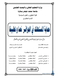 مقدمة الفصل التمهيدي : ماهية حماية المستهلك وتطورها التاريخي المبحث الأول : مفهوم حماية المستهلك المطلب الأول : تعريف حماية المستهلك المطلب الثاني : أطراف حماية المستهلك الفرع الأول : مفهوم المستهلك الفقرة الأولى : الإتجاه الموسع لمفهوم المستهلك الفقرة الثانية : الإتجاه المضيق لمفهوم المستهلك الفقرة الثالثة : موقف القضاء الفرنسي من الإتجاهين الفقرة الرابعة : تحديد مفهوم المستهلك في التشريع الجزائري الفرع الثاني : مفهوم المهني المبحث الثاني : التطور التاريخي لحماية المستهلك المطلب الأول : تطور حركة حماية المستهلك الفرع الأول : المرحلة الأولى : نهاية القرن 19 و بداية القرن العشرين الفرع الثاني : المرحلة الثانية : بدأت في الثلاثينيات من القرن العشرين الفرع الثالث : المرحلة الثالثة : بدأت في الستينيات من القرن العشرين المطلب الثاني : حماية المستهلك في المواثيق الدولية الفرع الأول : الإعلان العالمي لحقوق المستهلك الفرع الثاني : إعلان الأمم المتحدة الخاص بحماية المستهلك الفصل الأول : الحماية الفردية للمستهلك المبحث الأول : الإجراءات المتخذة من قبل المستهلك المطلب الأول : الإجراءات غير القضائية الفرع الأول : حماية المشرع لرضا المستهلك الفرع الثاني : الإجراءات المتخذة من قبل المستهلك عند تسلم المنتوج الفرع الثالث : الإجراءات المتخذة من قبل المستهلك عند إكتشاف عيب بالمنتوج الفقرة الأولى : العيب الموجب للضمان الفقرة الثانية : حقوق المستهلك الناشئة عن قيام الضمان الفقرة الثالثة : كيفية تنفيذ الضمان و آجاله المطلب الثاني : الإجراءات القضائية التي يتخذها المستهلك الفرع الأول : الاختصاص في دعوى حماية المستهلك الفقرة الأولى : الاختصاص النوعي في دعوى حماية المستهلك الفقرة الثانية : الاختصاص المحلى فى دعوى حماية المستهلك الفرع الثاني : الإثبات في دعوى حماية المستهلك الفرع الثالث : التقادم في دعوى حماية المستهلك المبحث الثاني: الإجراءات المتخذة من قبل المهني المطلب الأول : الإجراءات المتخذة قبل عرض المنتوج في السوق الفرع الأول : الإجراءات التي تستهدف سلامة المستهلك الفقرة الاولى : الحصول على رخصة الإنتاج أولا : الحصول على رخصة إنتاج المواد الخطرة ثانيا : الحصول على رخصة تقديم الخدمات الفقرة الثانية : تقديم تصريح بالصيغة الكاملة للمنتوج الفرع الثاني : الإجراءات التي تستهدف إعلام المستهلك الفقرة الأولى : تغليف المنتوج أولا : تغليف المواد الغذائية ثانيا : تغليف المواد غير الغذائية ثالثا : تغليف المنتجات الخطرة الفقرة الثانية : وسم المنتوج أولا : وسم المواد الغذائية ثانيا : وسم المواد غير الغذائية الفرع الثالث : الإجراءات التي تستهدف الحفاظ على المصالح المادية للمستهلك الفقرة الأولى : مطابقة المنتوج أولا : مطابقة المنتوج للمواصفات الوطنية ثانيا : مطابقة المنتوج للوائح الفنية ثالثا : الإشهاد على مطابقة المنتوج الفقرة الثانية : مراقبة مطابقة المنتوج للمواصفات و اللوائح الفنية المطلب الثاني: الإجراءات المتخذة عند عرض أو تسليم المنتوج للمستهلك الفرع الأول : الإجراءات المتخذة عند عرض المنتوج في السوق الفقرة الأولى : الإعلام بالأسعار و شروط البيع الفقرة الثانية : نظافة المنتوج الفرع الثاني : الإجراءات المتخذة عند تسليم المنتوج للمستهلك الفقرة الأولى : تقديم شهادة الضمان الفقرة الثانية : تقديم الفاتورة أو وثيقة قانونية أخرى الفصل الثاني : الحماية الجماعية للمستهلك المبحث الأول : الإجراءات المتخذة من قبل الهيئات الإدارية المطلب الأول : الإجراءات المتخذة من قبل مديرية التجارة الفرع الأول : التعريف بمديرية التجارة الفرع الثاني : الإجراءات المتخذة فى إطار الرقابة على الممارسات التجارية الفقرة الأولى : إقتراح غرامة أولا : غرامة محدّدة ثانيا : غرامة نسبية الفقرة الثانية : حجز السلع أولا : الحجز العيني ثانيا : الحجز الاعتباري الفقرة الثالثة : إقتراح الغلق الاداري الفرع الثالث: الإجراءا