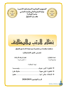 مقدمة الفصل الأول: نظام الرتب في الوظيف العمومي تمهيد المبحث الأول: مفهوم نظام الرتب في الوظيف العمومي المطلب الأول: مفهوم الرتبة المطلب الثاني: تصنيف الرتب في الوظيف العمومي المبحث الثاني: نظام الترقية في الرتبة المطلب الأول: الطبيعة القانونية للترقية في الرتبة المطلب الثاني: الضوابط التي تحكم الترقية في الرتبة خلاصة الفصل الأول الفصل الثاني: نظام الوظائف في الوظيف العمومي تمهيد: المبحث الأول: نظام الوظيفة العمومية المطلب الأول: مفهوم الوظيفة العمومية المطلب الثاني: الضوابط التي تحكم نظام الوظيفة العمومية المبحث الثاني: نظام الوظيفة العليا المطلب الأول: مفهوم الوظيفة العليا المطلب الثاني: الضوابط التي تحكم الوظيفة العليا ملخص الفصل الثاني خاتمة