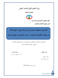 | عنوان المذكرة: | أهمية ممارسة العلاقات العامة في إدارة جائحة كورونا (كوفيد 19) في المؤسسة الاقتصادية الجزائرية – دراسة حالة بمؤسسة سونلغاز غرداية |