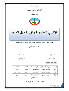 مقدمة الفصل الأول: الإطار المفاىيمي للإفراج المشروط المبحــث الأول: مفهوم الإفراج المشروط المـطلب الأول: تعريف الإفراج المشروط المطلب الثاني: تمييز الإفراج المشروط عن غيره من الأنظمة مشابهة له 1- نظام الإفراج المشروط ونظام وقف تنفيذ العقوبة 2- الإفراج المشروط ونظام الحرية النصفية 3- الإفراج المشروط ونظام التوقيف المؤقت لتطبيق العقوبة 4- الإفراج المشروط ونظام تأجيل المؤقت لتنفيذ الأحكام الجزائية المبحث الثاني: الطبيعة القانونية للإفراج المشروط المطلب الأول: التكييف القانوني للإفراج المشروط الفرع الأول: الإفراج المشروط عمل إداري الفرع الثاني: الإفراج المشروط عمل قضائي المـطلب الثاني :خصائص الإفراج المشروط أولا: الإفراج المشروط لا ينهي العقوبة ثانيا: الإفراج المشروط لا يعتبر حق للمحكوم عليه ثالثا: الإفراج المشروط وسيلة لتخفيف اكتظاظ السجون رابعا: الإفراج المشروط ليس إفراج نهائي خامسا: الإفراج المشروط ىو وسيلة عقابية خلاصة الفصل الأول الفصل الثاني: ضوابط الإفراج المشروط وآثاره المبحث الأول: ضوابط الإفراج المشروط في التشريع الجزائري المطلب الأول: الشروط الموضوعية للإفراج المشروط الشرط الأول: تطبيق الإفراج المشروط على المحكـوم علـيهب بعقوبـات سـالبة للحرية قصيرة المدة الشرط الثاني: قضاء فترة الاختبار من مدة العقوبة في المؤسسة العقابية الشرط الثالث: سلوك المحبوس والضمانات الجدية التي يقدمها الشرط الرابع: أداء المحبوس الالتزامات المالية المحكوم بها عليه الشـــرط الخـــامس: الاســـتثناءات الـــواردة علـــى الشـــروط الموضـــوعية الـــواردة بالمادة 134 المطلب الثاني: الشروط الشكلية للإفراج المشروط المرحلة الأولى: مرحلة الطلب أو الاقتراح المرحلة الثانية: مرحلة التحقيق السابق المرحلة الثالثة: مرحلة صدور القرار النهائي للإفراج المشروط المبحث الثاني: آثار الإفراج المشروط المطلب الأول: الآثار الناتجة عن الإفراج المشروط 1- إخلاء سبيل المحكوم عليو قبل انقضاء العقوبة 2- فرض الالتزامات الخاصة وتدابير المراقبة والمساعدة 3- المعاملة التهذيبية للمفرج عنهب شرطيا 4- الرعاية اللاحقة للمفرج عنهب شرطيا 5- أثر الإفراج المشروط على العقوبات التكميلية المطلب الثاني: انتهاء الإفراج المشروط الفرع الأول: انقضاء مدة الإفراج المشروط الفرع الثاني: إلغاء الأفراج المشروط أولا: إخلال المفرج عنو بالالتزامات المقررة للمراقبة والمساعدة ثانيا: صدور حكب نهائي جديد يدين المفرج عنه شرطيا ثالثا: إفراج مشروط يؤثر سلبا على الأمن والنظام العام خلاصة الفصل الثاني خاتمة