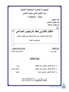 المذكرة بعنوان “النظام القانوني لعقد الترخيص الصناعي “