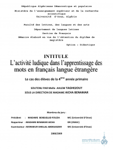 INTITULE L’activité ludique dans l’apprentissage des mots en français langue étrangère Le cas des élèves de la 4ème année primaire |