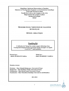 Intitulé L’utilisation de l’image fixe comme support didactique dans l’enseignement/apprentissage du français langue étrangère en Algérie Cas de la 3ème année primaire |
