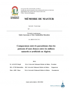 Comparaison entre le parasitisme chez les poissons d’eaux douces entre les milieux naturels et artificiels en Algérie |