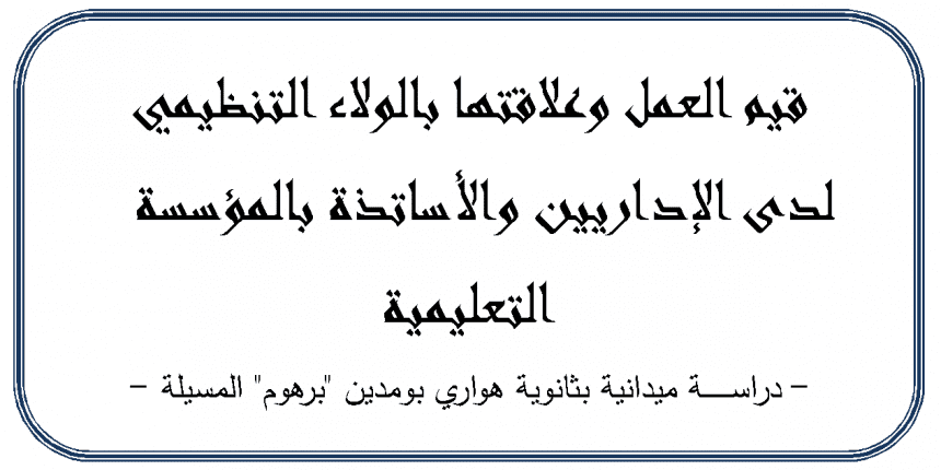 قيم العمل وعلاقتها بالولاء التنظيمي لدى الإداريين والأساتذة بالمؤسسة التعليميةدراسة ميدانية بثانوية هواري بومدين برهوم المسيلة |