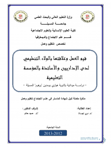 قيم العمل وعلاقتها بالولاء التنظيمي لدى الإداريين والأساتذة بالمؤسسة التعليميةدراسة ميدانية بثانوية هواري بومدين برهوم المسيلة |